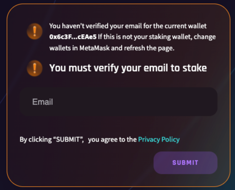 On the right side of the staking page, you will see instructions to verify your email in an orange box. Enter your email and click “Submit” to initiate another signature.