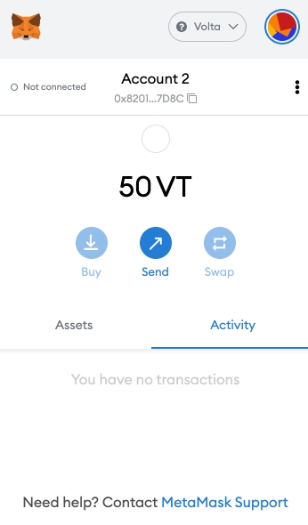 If your wallet is already connected to the Volta network, you will see your token balance in your wallet. For instructions on how to connect your MetaMask to the Volta Test Network, go here.