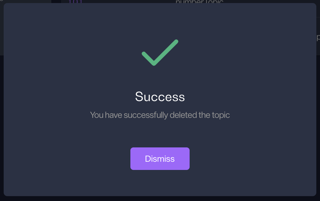 3. Success message will be shown, click `Dismiss` to close modal and view the topics list