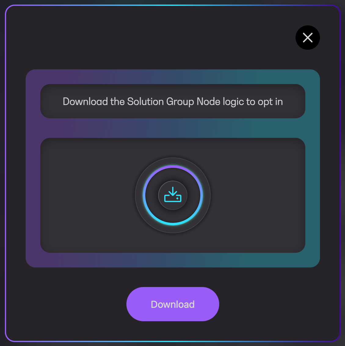 <figure><img src="https://4257445316-files.gitbook.io/~/files/v0/b/gitbook-x-prod.appspot.com/o/spaces%2Fnf3YeoQlQerc93GsC2Me%2Fuploads%2FhvRRRYhxq8u5JDL74pbQ%2Fimage.png?alt=media&#x26;token=8d837dd2-965f-4539-8721-9af03695b924" alt="" width="375"><figcaption><p>Download solution group node logic</p></figcaption></figure>