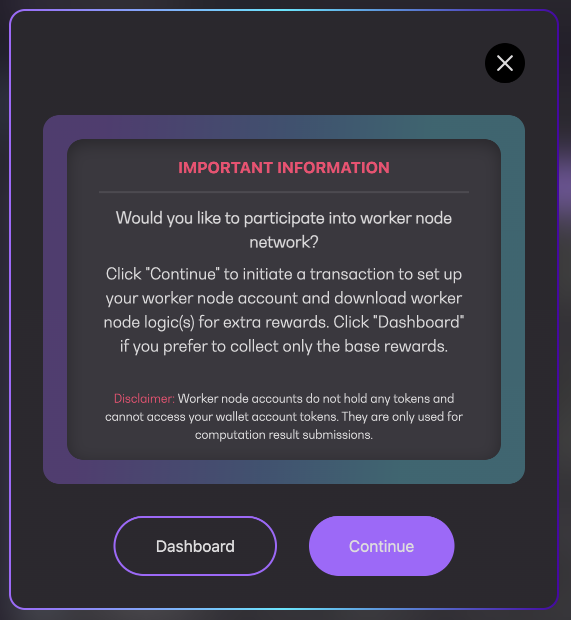 <figure><img src="https://4257445316-files.gitbook.io/~/files/v0/b/gitbook-x-prod.appspot.com/o/spaces%2Fnf3YeoQlQerc93GsC2Me%2Fuploads%2FwT7KjhQ1WIOB52LpWdtT%2Fimage.png?alt=media&#x26;token=93f0b7d9-8476-4869-904e-e054d3054afa" alt="" width="375"><figcaption><p>Participate into worker node network</p></figcaption></figure>