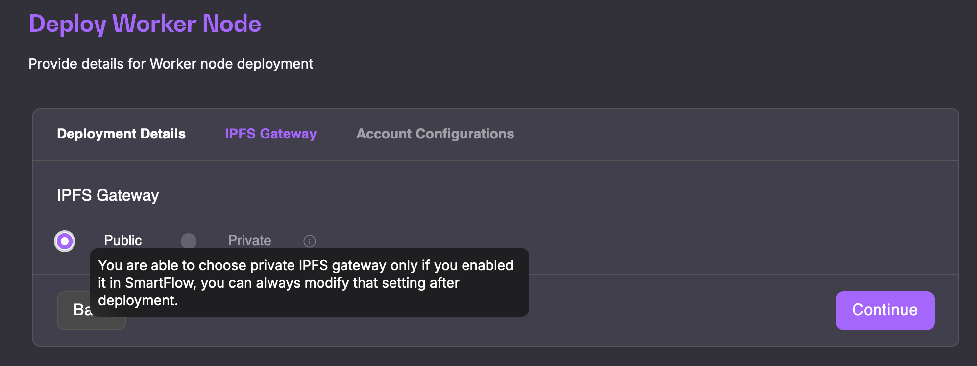 The second step is the IPFS Gateway. By default, you are always able to choose a Public IPFS gateway. Private and BYOC (bring your own credentials) for IPFS support will come in near future. Note that you can deploy your node with a Public gateway and change that setting in the future.