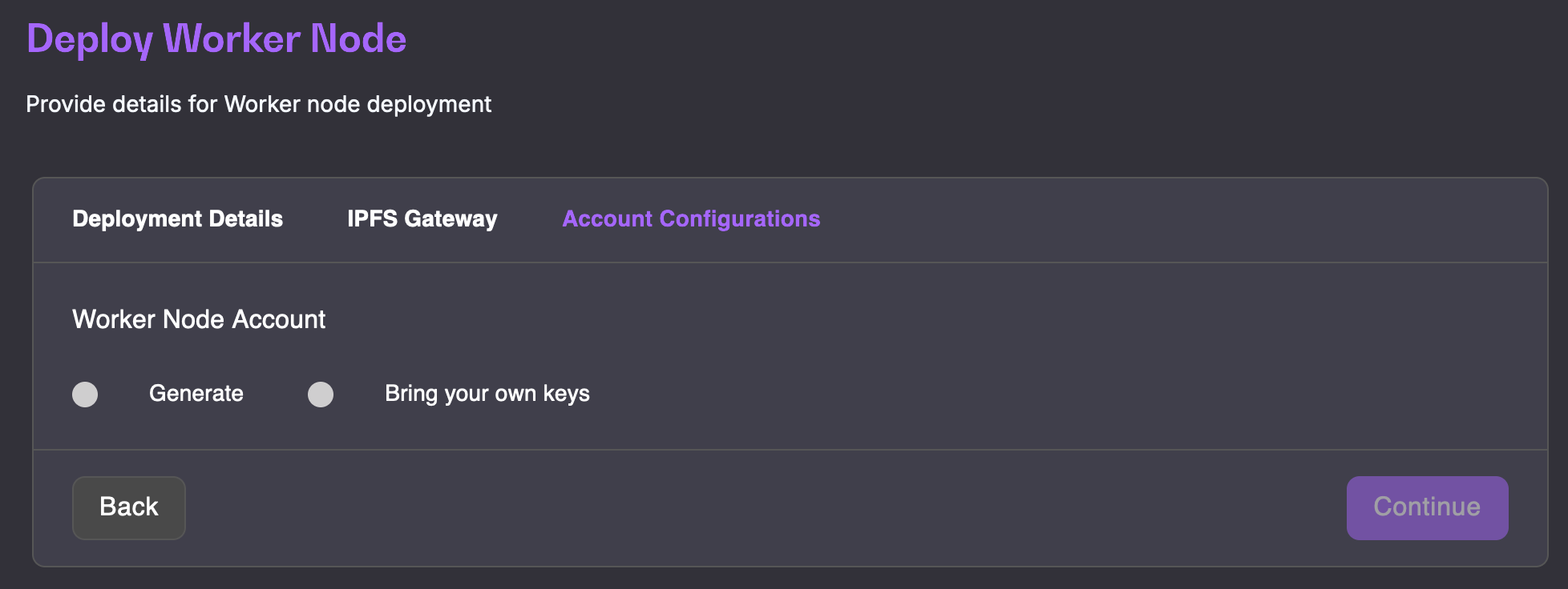 The third and last steps asks you to configure your Account. You can do that by either bringing your own keys should you already have an account you wish to use, or generate new keys. To bring your own keys, you will need the 12 words seed phrase. The account keys can be re-generated or imported even after deployment. ****** Side note - if you already have a running worker node behind marketplace desktop app, you can use the same Worker Account here as the one that you use on your local environment. Just remember to pause your Marketplace app worker engine after the set-up here is completed. You can always remove Launchpad Worker Node and re-enable Marketplace app worker at any time. Both workers can be enabled at the same time temporarily, but it will cause them to compete against each other and might cause unpredictable voting behaviour, hence this is not recommended. ******