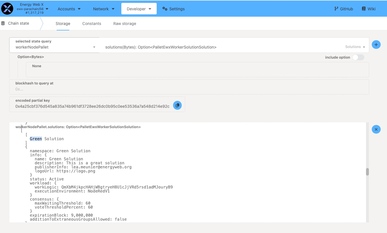 If you want to verify that your actions were correctly recorded on the blockchain: Go to polkadot.js interface choose workerNodePallet & either solutions or solution groups as shown below. On the top right, disable "include option" and click on the "+" symbol. You can then search for your Solution using the namespace and Solution group name that you have chosen at registration.