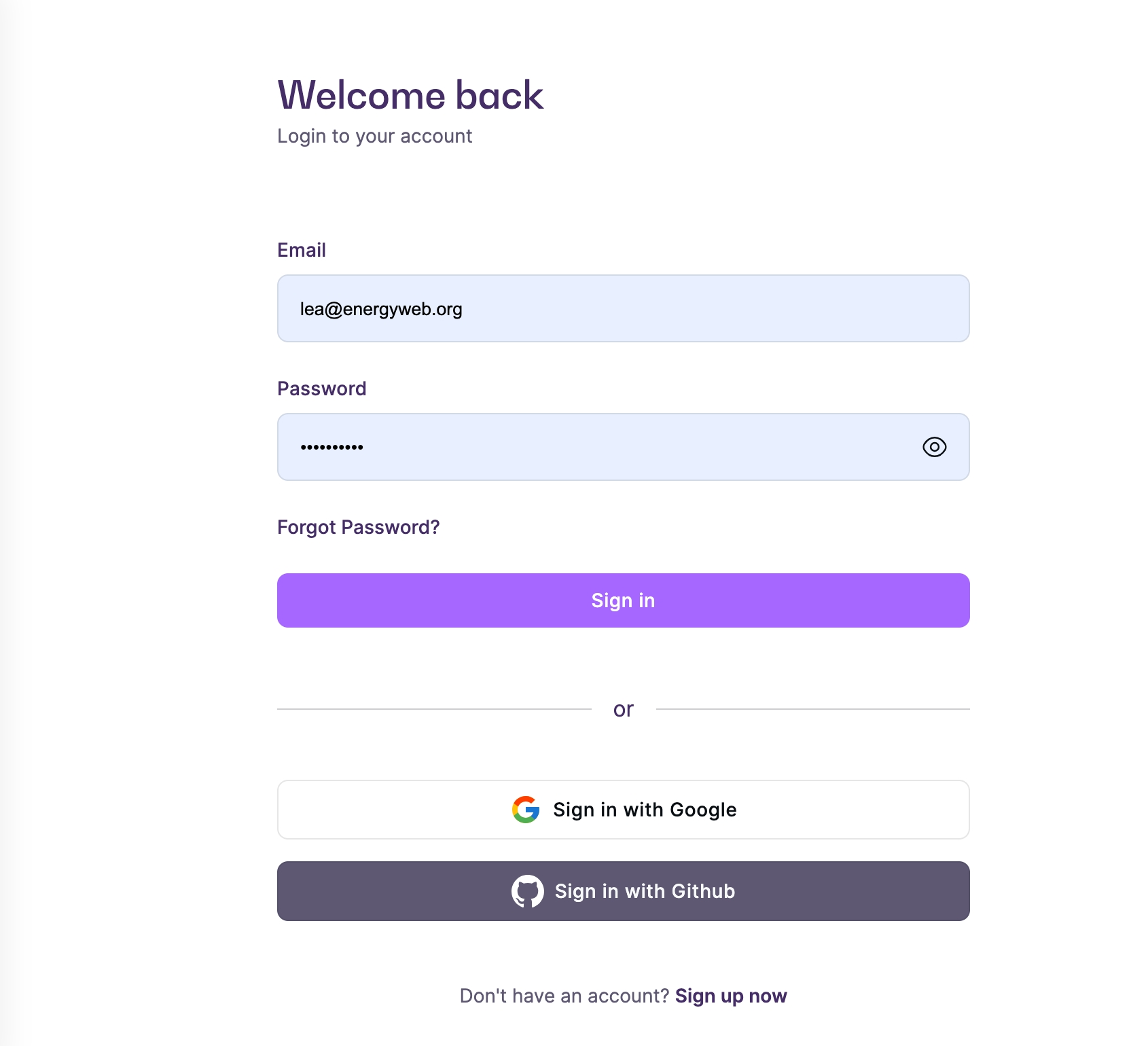 Go to https://launchpad.energyweb.org/ and login using your existing credentials if you are an Energy Web Member, or the social login options (Google, Apple and Github).