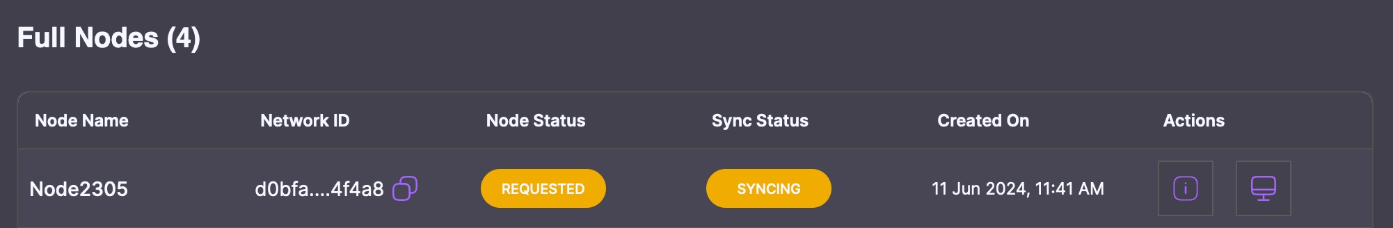 Your newly deployed node will show in the Worker Nodes table with the status "Requested"