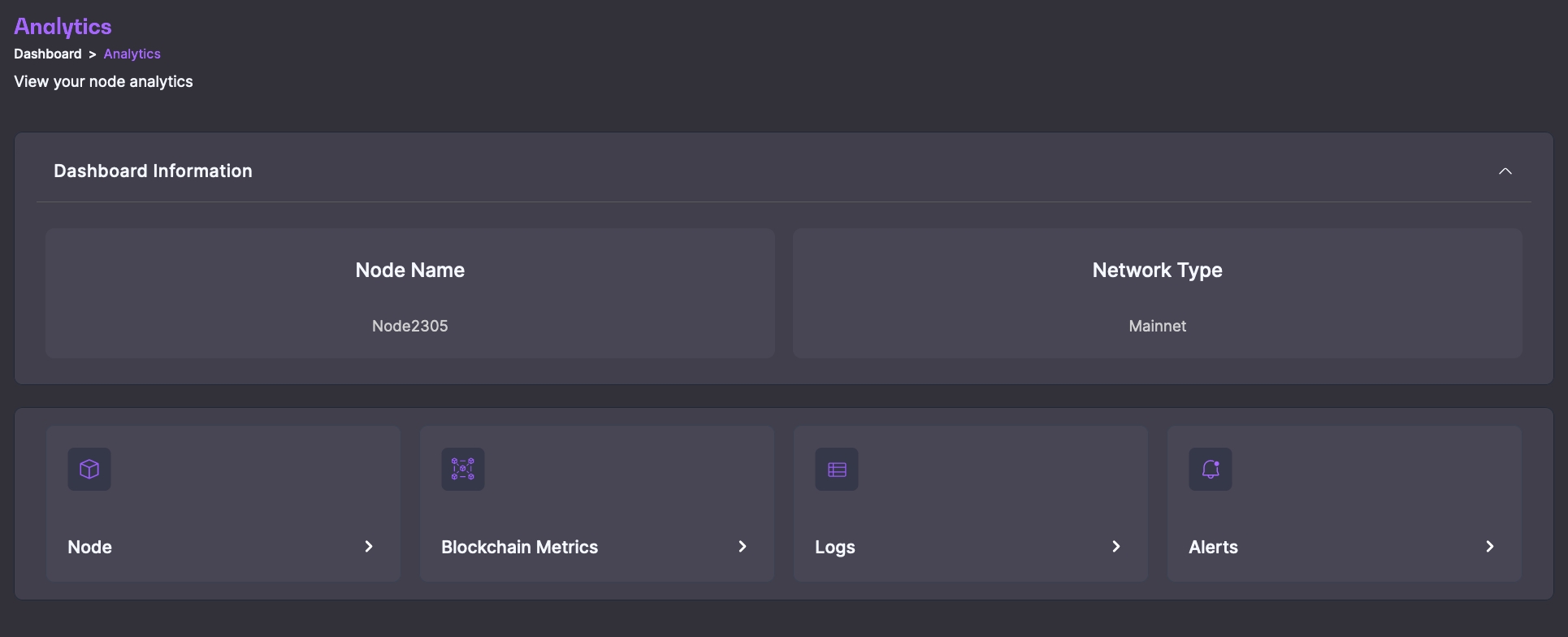 The analytics will provide in depth information about your Collator node's activities and health. You can find them by clicking on the "Monitor Node" button under "Manage", or via "View Analytics" in the details page.