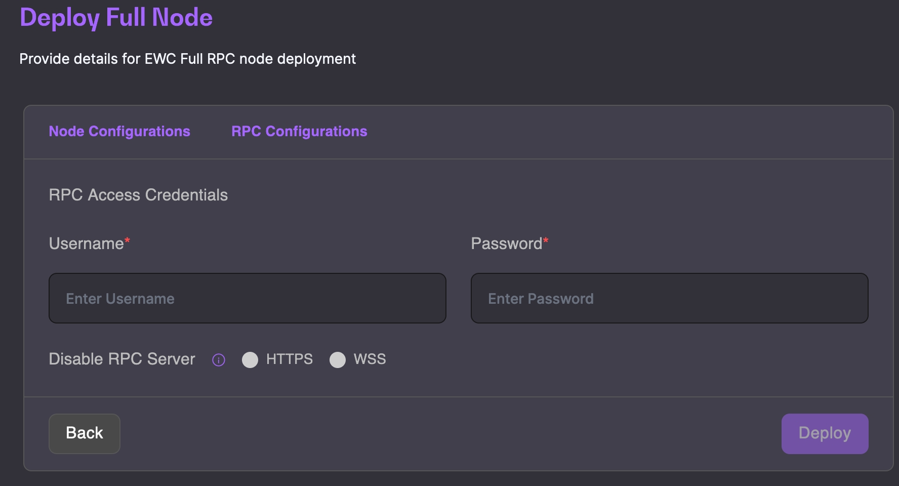 In the creation page, enter a name for your RPC endpoint and select the network that makes sense for your use case. The available networks are: EWC, EWX.